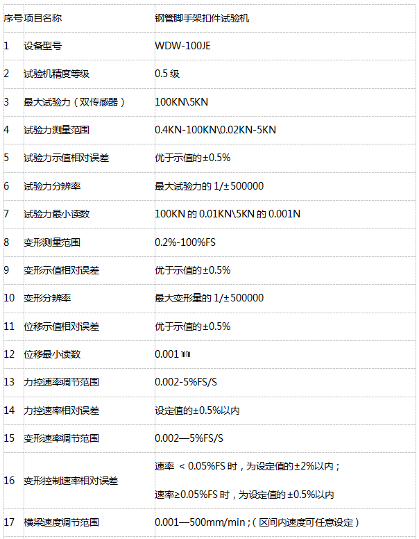 上述各項技術的綜合應用,保證了WDW-100JE微機控制腳手架扣件試驗機可以實現試驗力、試樣變形和橫梁位移等參量的閉環控制,可實現恒力、恒位移、恒應變、等速度載荷循環、等速度變形循環等試驗。